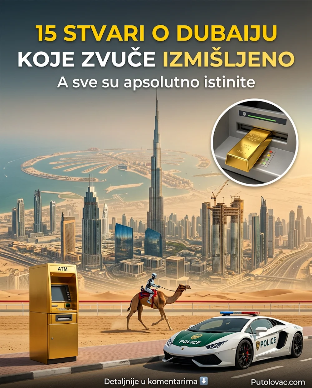 Zanimljivosti o Dubaiju zvuče kao da ih je neko izmislio tokom partije Monopola u kojoj su svi igrači dobili neograničen budžet. Grad koji je prije 50 godina bio pustinjsko ribarsko naselje danas ima NAJVIŠU zgradu na planeti, policiju koja vozi superautomobile i bankomat za zlato. Istražili smo 15 činjenica o ovom gradu i moramo priznati… neke smo morali provjeriti dva puta jer su nam djelovale nemoguće.